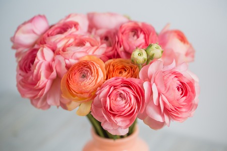 Spring background, flower Wallpaper. Persian buttercup. Bunch pink ranunculus flowers on light gray background. Vase on vintage wooden table. Wallpaper