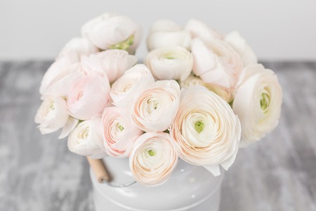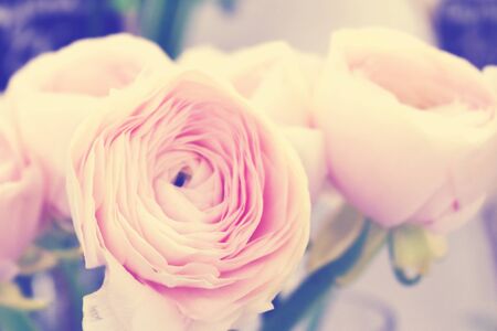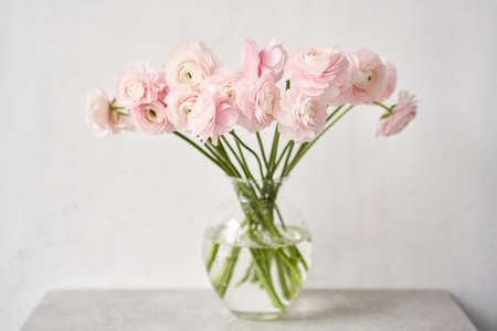Persian buttercup in glass vases. Bunch pale pink ranunculus flowers light background. Wallpaper. Winter season flowers