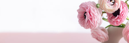 Tender ranunculus flowers in vase on pink background with copy space. Bunch of Persian buttercup in floral arrangements, top view, banner size