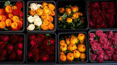 Plastic boxes filled with a rainbow of flowers, including red, orange, yellow, and pink varieties, stored for transportation to shops.