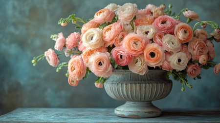 A stunning arrangement of pink and peach ranunculus flowers with green foliage. The soft lighting enhances their delicate beauty, creating a serene atmosphere in the setting.