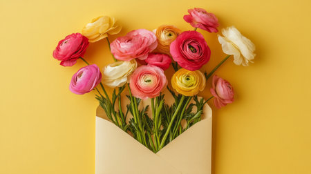 Colorful ranunculus flowers in a soft yellow envelope on a matching pastel yellow background, generative ai
