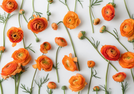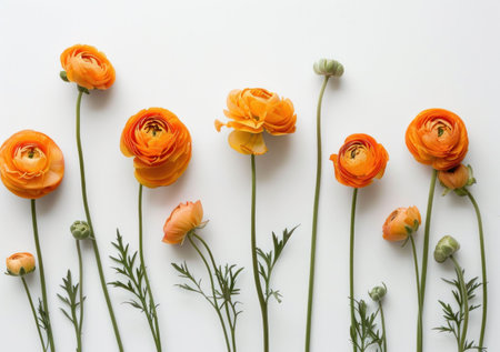Bright orange ranunculus flowers arranged elegantly on a white background