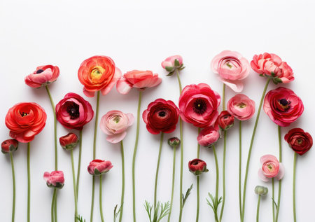 A colorful arrangement of blooming ranunculus flowers on a white background, showcasing various shades of pink, red, and orange