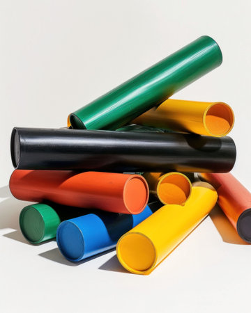 Colorful rolled tubes stacked together in abstract arrangement on a light background The vibrant colors create a playful and creative impression