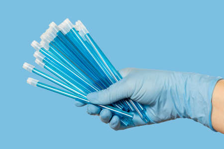 Dentist's hand in a latex glove with saliva ejectors on the blue background. Medical tools concept.