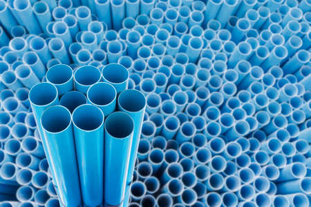 Close up to blue plastic pipe background, PVC pipes stacked in warehouse, PVC water pipes used for construction.