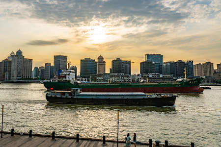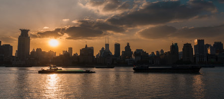 Shanghai Huangpu River Picturesque View of Cargo Freight Ships and Cityscape at Background During Sunset