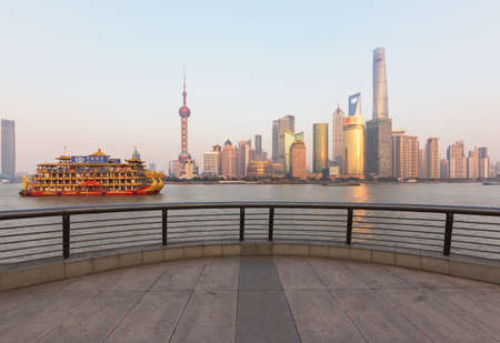 SHANGHAI CHINA, APRIL 2019 : morning sunrise at the bund, huangpu riverside, shanghai city view background