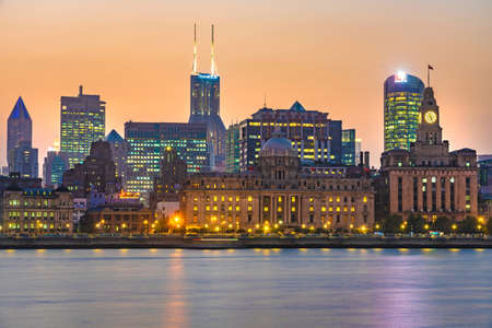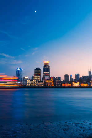 Landscape view at the Bund in the evening. The Bund is a waterfront area in central Shanghai.