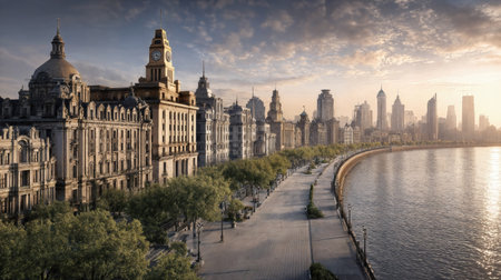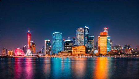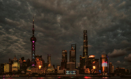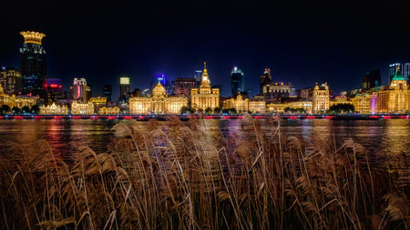 The Bund waterfront in Shanghai, China, where illuminated historic edifices and shimmering modern skyscrapers converge along a reflecting river to reveal an iconic urban vista