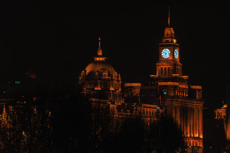 SHANGHAI, CHINA - OCTOBER 24, 2019: Night view of the historical buildings at The Bund in Shanghai, China