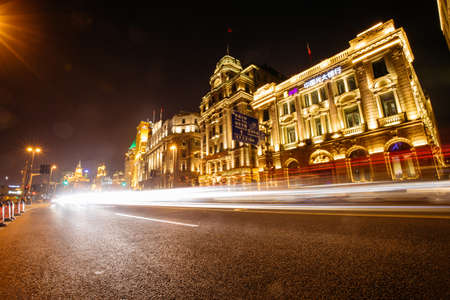 light trails on the street with classical buildings at night in shanghai