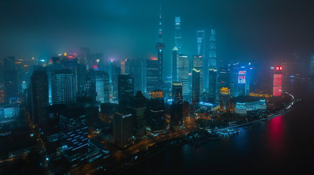 Shanghai skyline at night with fog and lights, China.