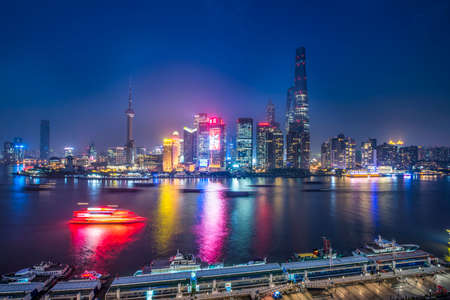 Cityscape view of Shanghai city at night. Skyscraper of the Bund, view from Lujiazui in Pudong of Shanghai, China. landmark and popular for tourism attractions. Travel and Vacation concept
