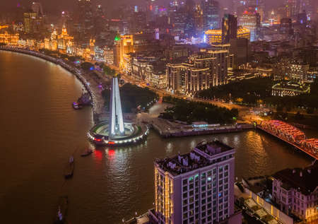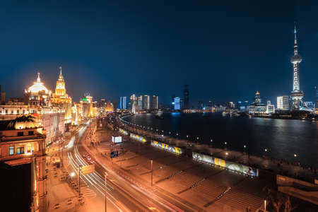 The Bund at night in Shanghai, China. The Bund is a major commercial and administrative center of Shanghai.