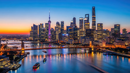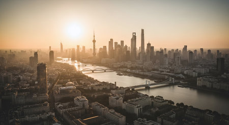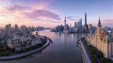 Shanghai cityscape where futuristic skyscrapers and historic landmarks merge in a dynamic panorama highlighting modern innovation and timeless cultural legacy.