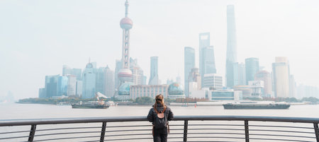 woman traveler visiting in Shanghai, China. Female Tourist with backpack sightseeing Shanghai view of Lujiazui in The Bund of Shanghai. landmark and popular for tourism attractions. Vacation concept