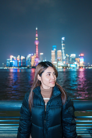 woman traveler visiting in Shanghai, China. Happy Female Tourist sightseeing Shanghai view of Lujiazui in The Bund of Shanghai at night. landmark and popular for tourism attractions. Vacation concept