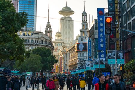 SHANGHAI, CHINA - FEBRUARY 13, 2018: Neon signs lit on Nanjing Road. The area is the main shopping district of Shanghai and one of the world's busiest shopping streets.