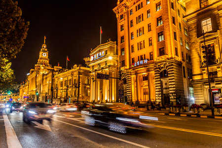 Old Customs Building Hong Kong Shanghai Bank Building Peace Hotel The Bund Old Part of Shanghai China Night Illuminated with Cars.