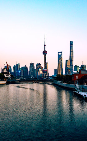 Shanghai skyline at sunset with reflection in Huangpu river,China.