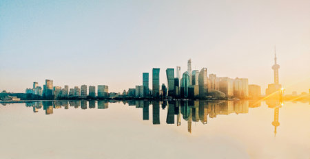 Cityscape view of Shanghai city in the morning. Skyscraper of Lujiazui in Pudong, view from The Bund of Shanghai, China. landmark and popular for tourism attractions. Travel and Vacation concept