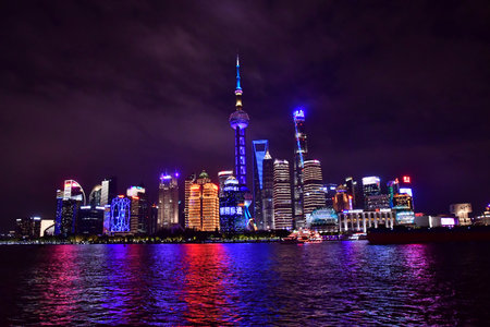 Shanghai, China, skyline at night as seen from the Bund walkway. Water in foreground, boat on right side, buildings illuminated, including Pearl Tower