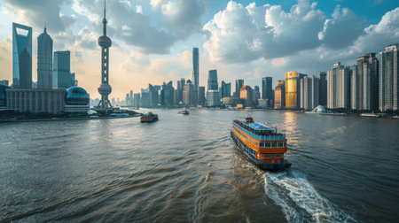 A river ferry crossing between two bustling city districts, urban transportation
