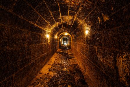 Dark and creepy old historical vaulted flooded underground drainage tunnel.