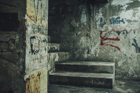 Concrete stairs in abandoned building with graffiti on the wall, vintage