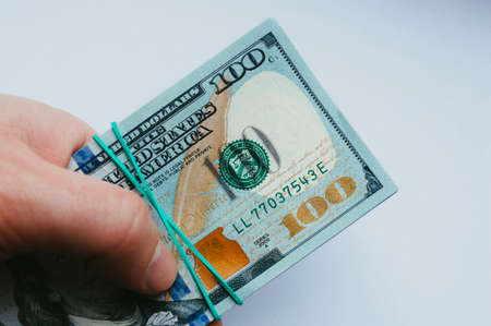 hundred dollar banknotes twisted and knitted by elastic on a light wooden. view from the side. close up copy space