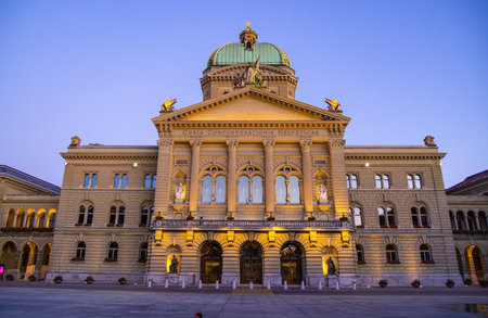 Bern, Switzerland with the Federal Palace illuminated at blue hour close up. The Swiss parliament building Bundeshaus in twilight.