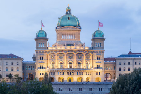 Bern, Switzerland with the Federal Palace blue hour. The Swiss parliament building Bundeshaus in twilight and autumn or fall.