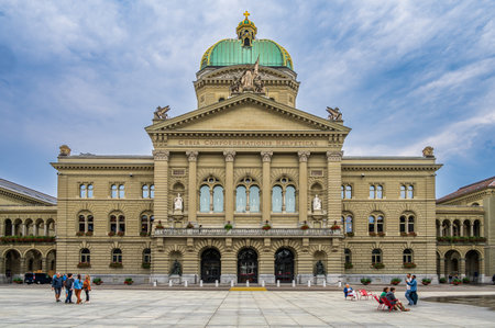 Bern, Switzerland - August 14, 2019: Building of the Swiss Parliament photographed from outside with people walking on the adjacent square. Government, administration. Swiss confederation. State.