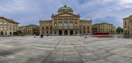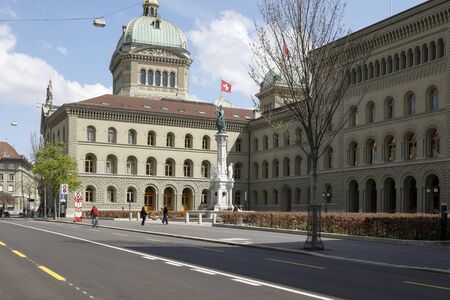 Bern, Switzerland - April 21, 2017: The Federal Palace, which is the seat of Federal Parliament (Swiss Federal Assembly), is located in a large building which dominates this part of the city.