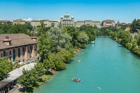 Bern, Switzerland - July 30, 2019: Panoramic view of Aare river at sunny summer day. Local residents relax, sunbathe and rafting in inflatable boats along the fast flow of the river.