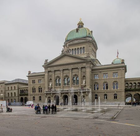 Bern, Switzerland - 19 October, 2015: view with the Federal Palace of Switzerland building on an overcast day, view from Bundesplatz square. The Federal Palace of Switzerland (German: Bundeshaus) is the building in Bern in which the Swiss Federal Assembly
