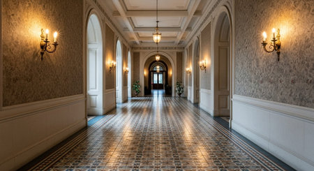 A stunning interior hallway showcasing luxury design, featuring elegant chandeliers, marble flooring, and lush plants, creating an atmosphere of opulence and tranquility.