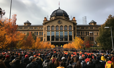 A crowd of individuals gathered in front of a building, standing and looking towards the structure.