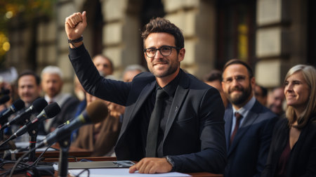 A man in a suit giving a speech to a crowd. Generative AI image.
