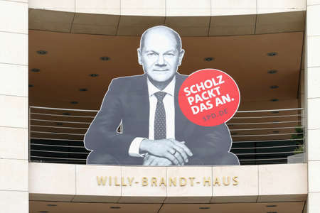Berlin, Germany, August 7, 2021, election campaign poster at Willy Brandt House, with the slogan: Scholz tackles this