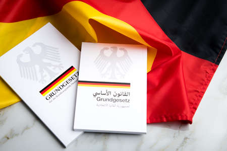 The constitution basic law book of Germany in German and Arabic language on flag and marble background