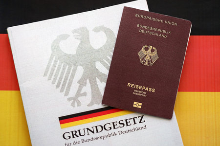 The constitution basic law book of Germany and passport lies on Germany flag background close up