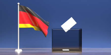 Germany election 2021, Envelope on ballot box slot, vote to elect the members of the Bundestag. Glass transparent voting container and German national flag on blue background, space. 3d illustration