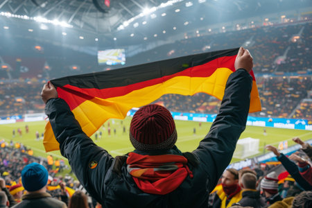 Happy German fan at stadium with flag. Festive football spirit