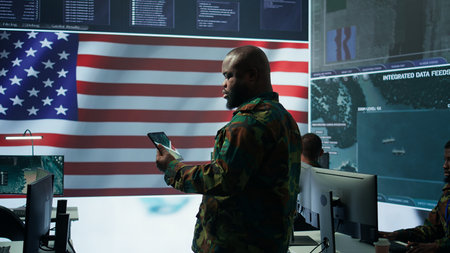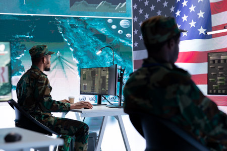 Government intelligence soldiers in a control room oversee surveillance missions, monitoring real time data and coordinating security measures, for national protection. Command post.