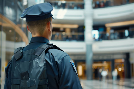 Security guard professional safety patrol man police employee mall safe business protect serve confident authority public space secure guarding agent staff shop convenience store grocery