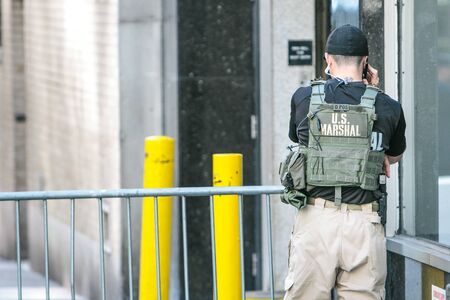 New York City, 9/27/2019: US marshal is talking on the phone while deployed to a police checkpoint near the UN headquarters Manhattan during General Assembly.