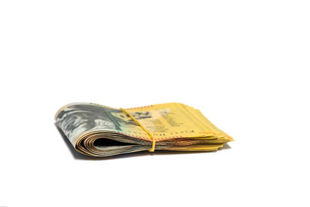 Australian money, Stack of fifty Australian dollar bills on white background.
